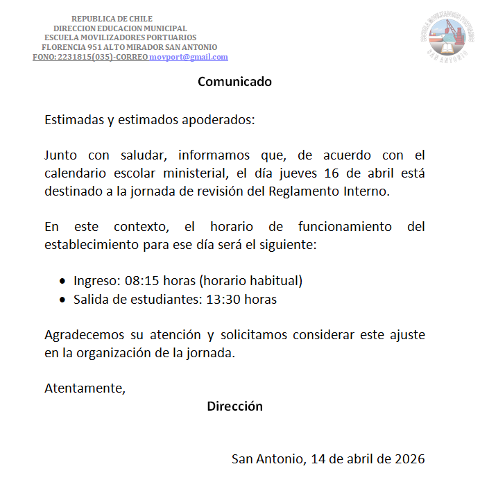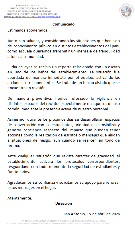 Estimada comunidad educativa de la Escuela Movilizadores Portuarios,